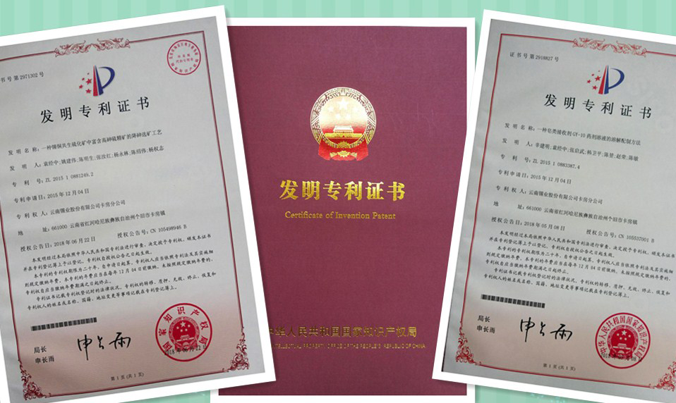 近日,卡房分公司申报的发明专利《一种共生硫化矿中富含高砷硫精矿的降砷选矿工艺》《一种皂类捕收剂GY-10药剂溶液的溶解配制方法》获得国家知识产权局正式授权,并被授予国家发明专利证书。