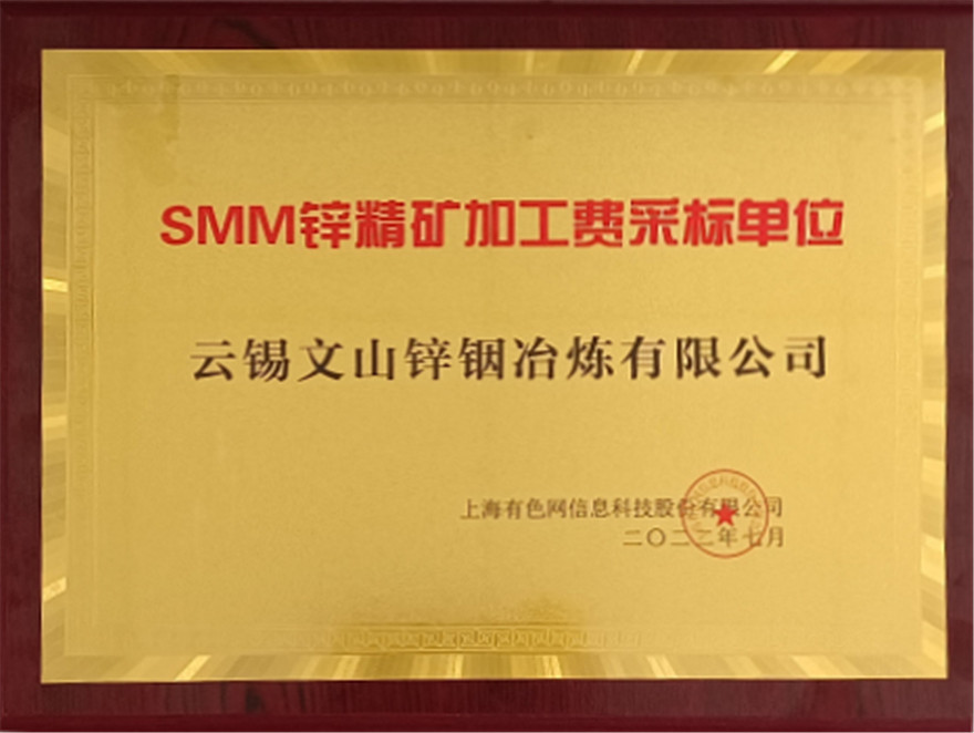 近日,文山锌铟冶炼有限公司被上海有色网(SMM)评为“SMM锌精矿加工费采标单位”。