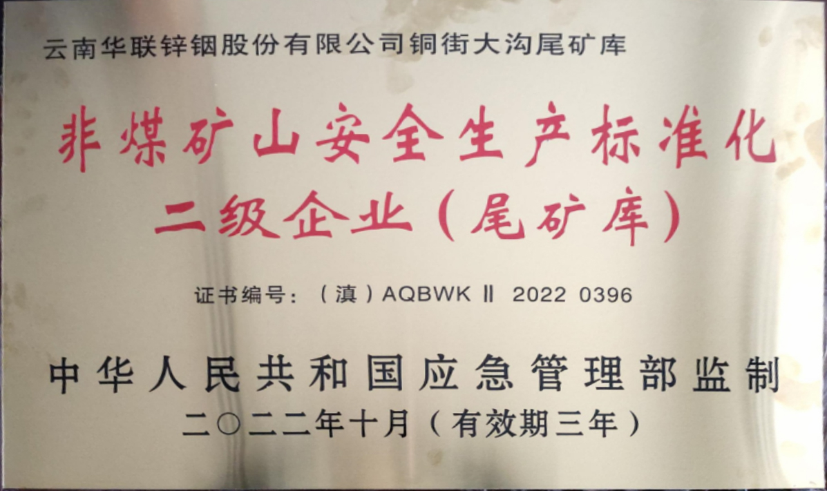 近日,华联锌铟公司铜街大沟尾矿库、新田尾矿库顺利获得“非煤矿山安全生产标准化二级企业”认定,并收到由中华人民共和国应急管理局监制、云南省应急管理厅颁发的牌匾和证书。
