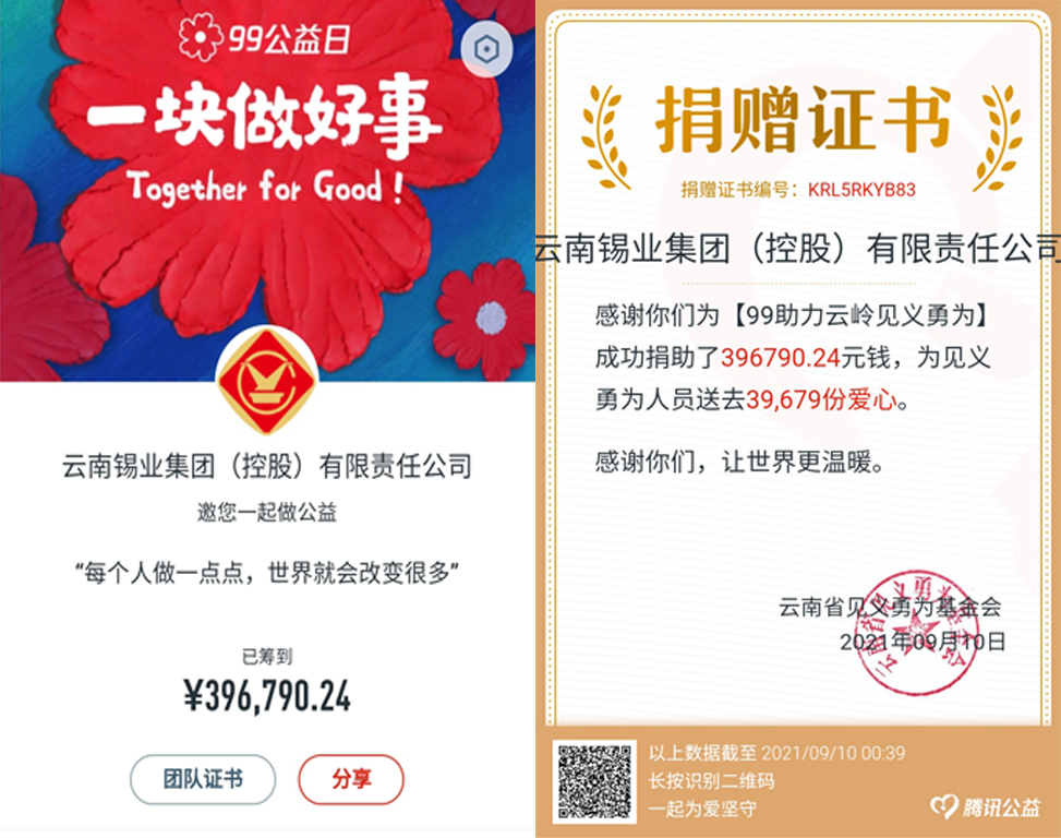 云锡控股公司积极响应云南省见义勇为基金会号召,连日来大力开展“99公益日·助力云岭见义勇为”宣传募捐活动,共同唱响新时代的英雄赞歌。截止9月9日24时,云锡共有13277人次通过手机微信扫码的方式参与网络募捐活动,累计捐款396790.24元。