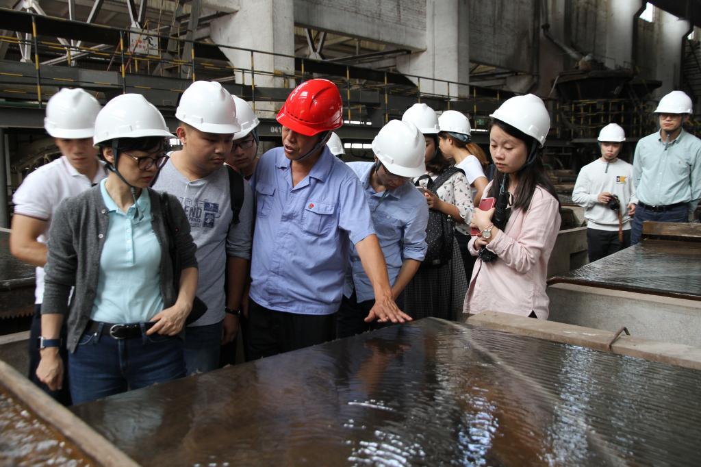学员们先后参观了熔炼车间精矿仓、反射炉旧址、顶吹炉主控室、精炼车间电热连续结晶机、圆盘自动浇铸机及锡库,详细了解了锡冶炼流程的设备原理、操作控制、工艺原理、入炉原料品位等方面情况。
