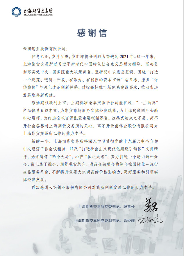 2022年的市场环境更趋复杂严峻和不确定,回顾2021年与上期所风雨同舟,我们展望2022年与上期所进一步加强合作,推动锡产业高质量发展再创辉煌。