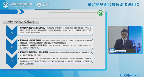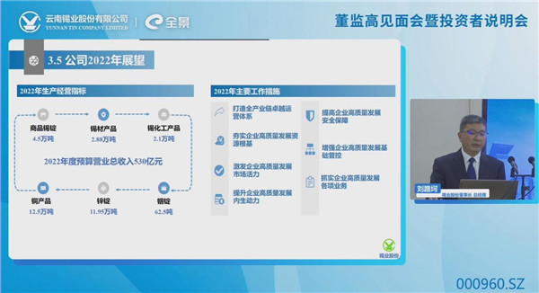 董事长、总经理刘路坷介绍了公司资源、业务产业链、产品及近期生产经营情况,同时充分阐述了公司未来发展战略,即围绕着打造全球锡、铟全产业链供应链“链主”的发展愿景,以“绿色智能补链、精深加工延链、改革创新强链”为发展理念,围绕资源拓展、现代矿山、原材料制造、新材料和精深加工、供应链五个业务单元布局有色金属全产业链,助推上市公司高质量发展。