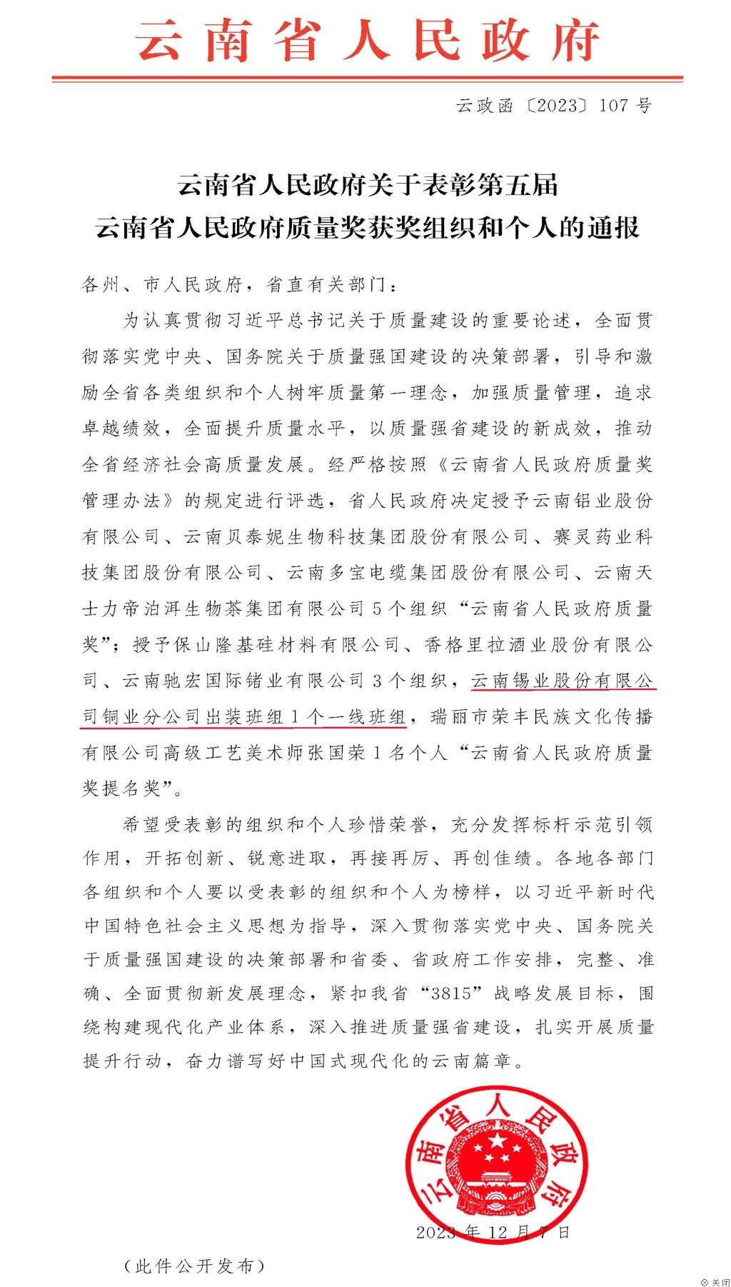 云南省人民政府质量奖是省级最高质量工作荣誉奖,设立的初衷是引导、激励全省各行各业加强质量管理,追求卓越绩效。本届评选首次加入了一线班组,评选过程严格遵循公开、公正、公平的原则,由专家评审委员会进行评审,最终确定获奖名单。