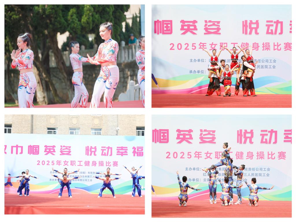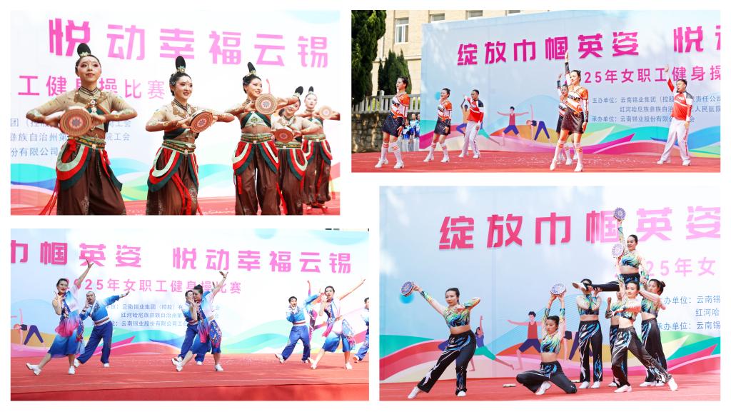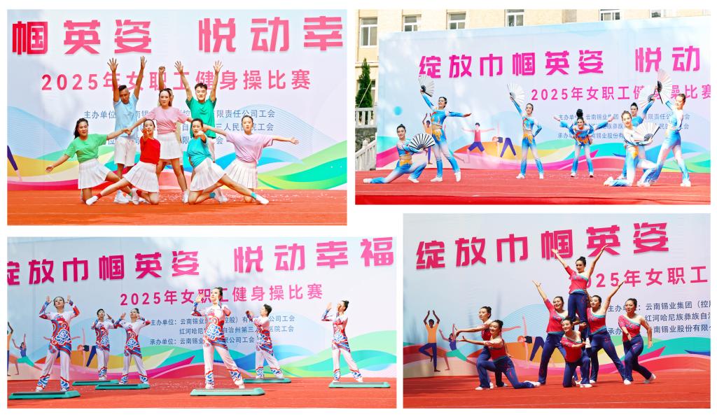赛事设置民族健身操规定套路《同心共筑中国梦》及自编有氧健身操两大项目。各参赛队伍身着统一服装,精神抖擞,依次登台亮相。在第一轮规定套路比赛中,各队把动感十足的现代健身操与民族特色元素融合创意编排。伴随着欢快的音乐节奏,选手们伸展、跳跃、旋转,动作流畅自然,充满力量感与节奏感,用灵动的舞姿和自信的笑容,诠释着对健身操运动的热爱,展现广大云锡女职工积极向上、团结协作的精神风貌,充分诠释巾帼风采与健康云锡的主题内涵。